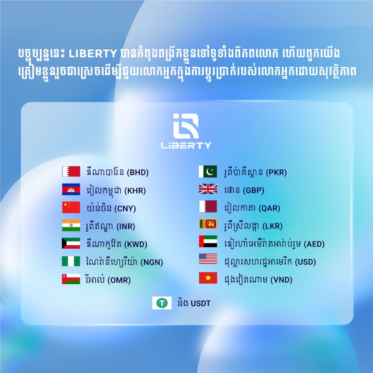 LIBERTY អាចប្ដូរប្រាក់បានដល់ 15 រូបិយប័ណ្ណ។
