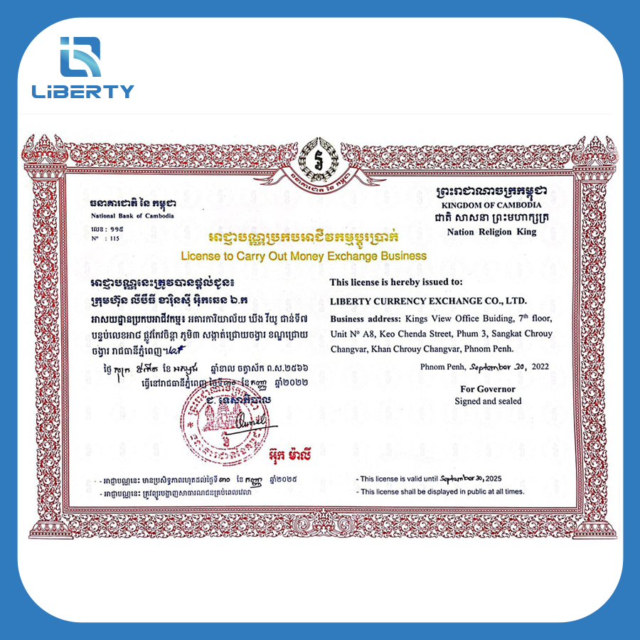 LIBERTY 获得柬埔寨国家银行颁发的货币交易执照