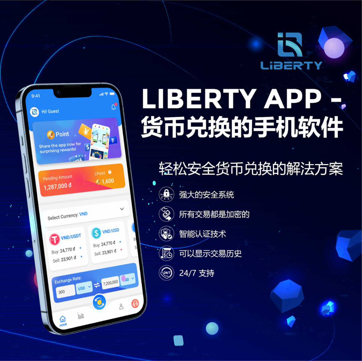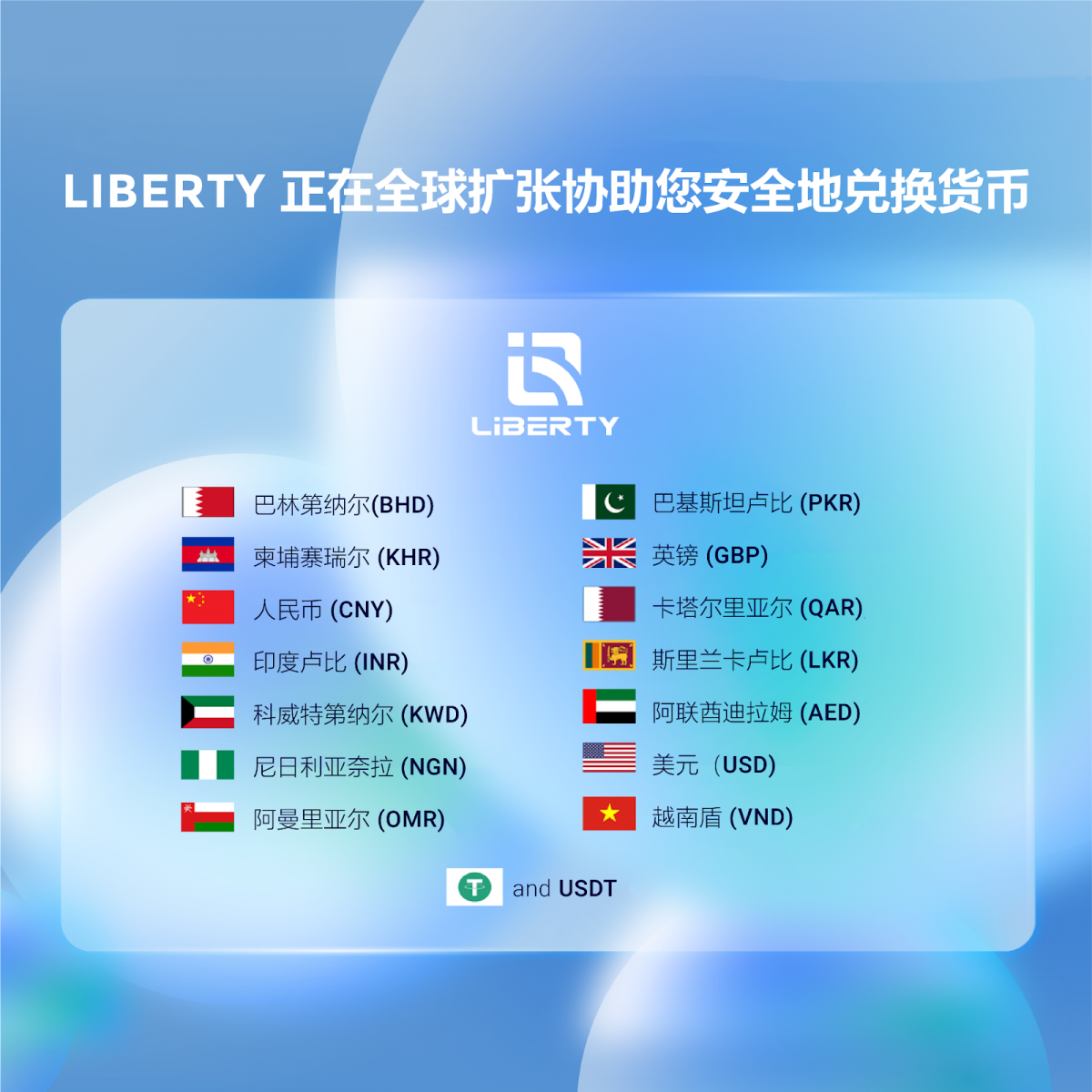 经过2年多的不断发展壮大,LIBERTY现已将业务扩展至全球共14个国家,包括越南、中国、柬埔寨、印度、英国、美国、美国、阿拉伯联合酋长国(UAE)、巴基斯坦、尼日利亚、斯里兰卡、科威特、卡塔尔、阿曼、巴林。相应地,LIBERTY 支持 15 种货币的转换,包括 VND、CNY、KHR、INR、GBP、USD、AED、PKR、NGN、LKR、KWD、QAR、OMR、BHD,尤其是 USDT 加密货币
